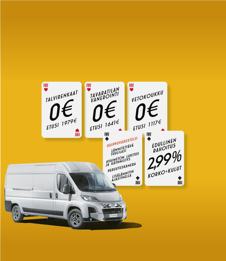 Tarjoamme nyt Fiat Professional -hyötyajoneuvoihin edullisen rahoitustarjouksen: korko vain 2,99 % +kulut (avausmaksu 345 € ja kuukausittainen käsittelymaksu 14€). Rahoitustarjous on voimassa uusiin asiakastilauksiin enintään 31.12.2025 saakka. Rahoitus edellyttää hyväksytyn luottopäätöksen ja kaskovakuutuksen. Palvelun tuottaa DNB Auto Finance Oy, Urho Kekkosen katu 7B, 00100 Helsinki.