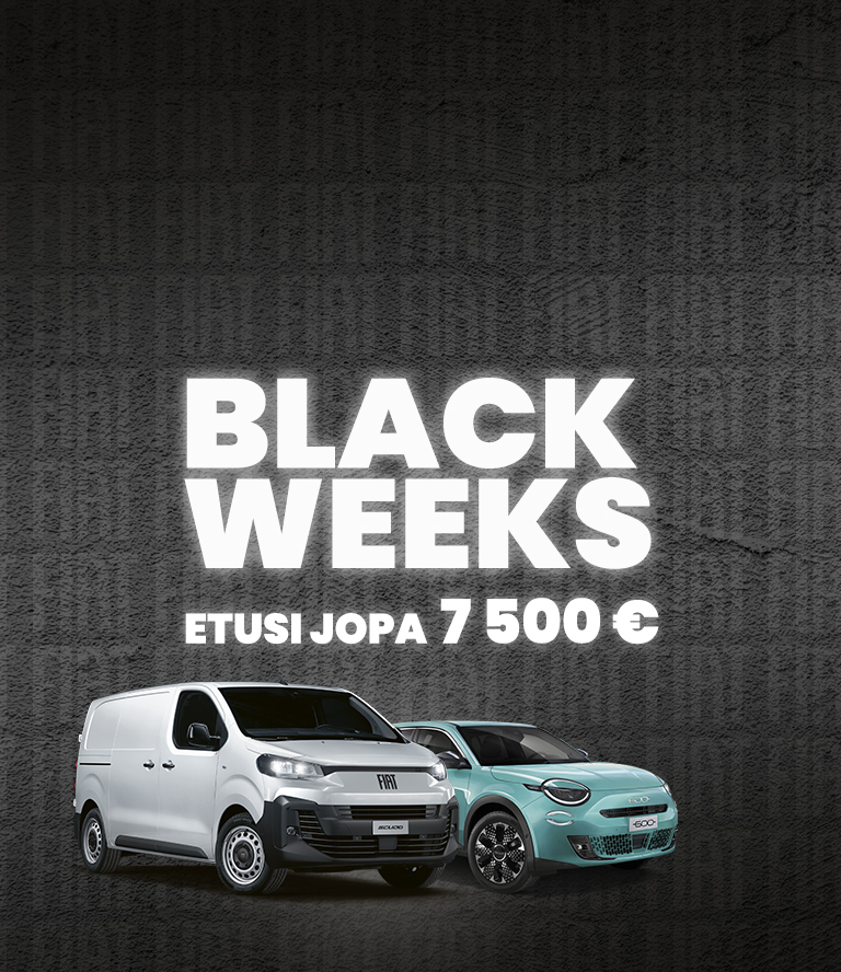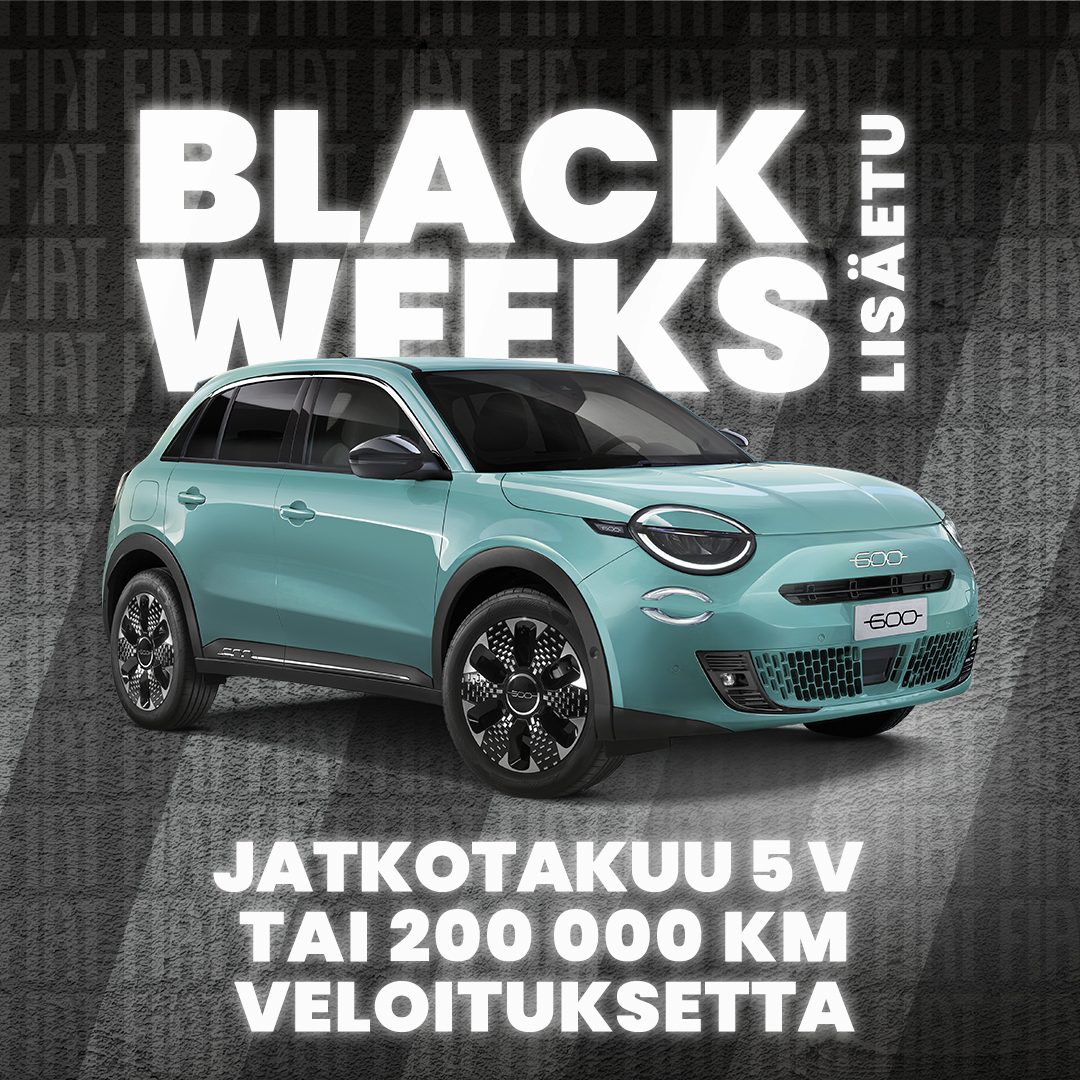 - EDULLISET FIAT 600 SUV HYBRID- JA SÄHKÖMALLIT: NYT BLACK WEEKS -LISÄETUNA JATKOTAKUU 5 V TAI 200 000 KM VELOITUKSETTA. ETUSI YHTEENSÄ JOPA 3 336 €.